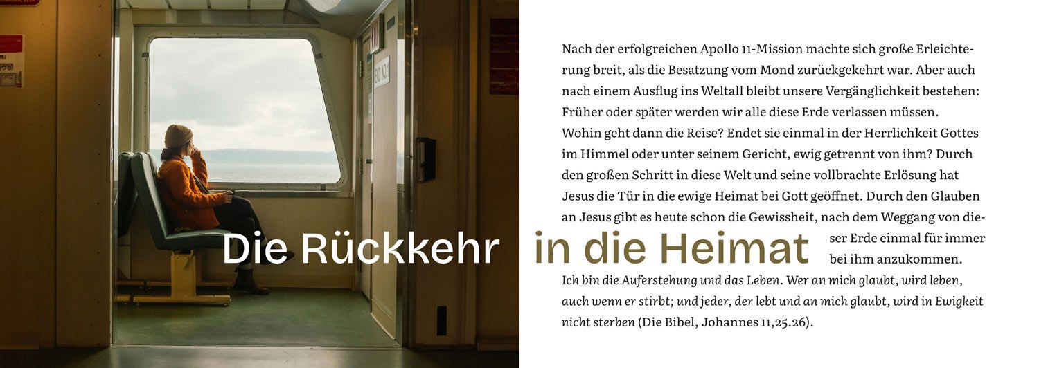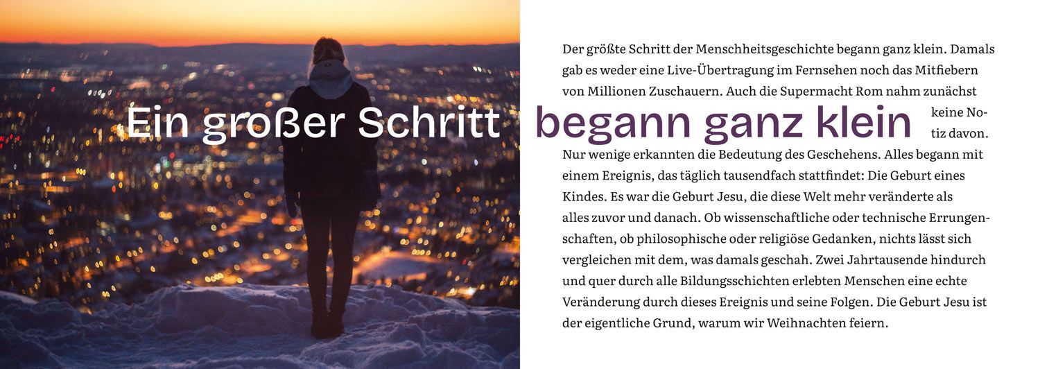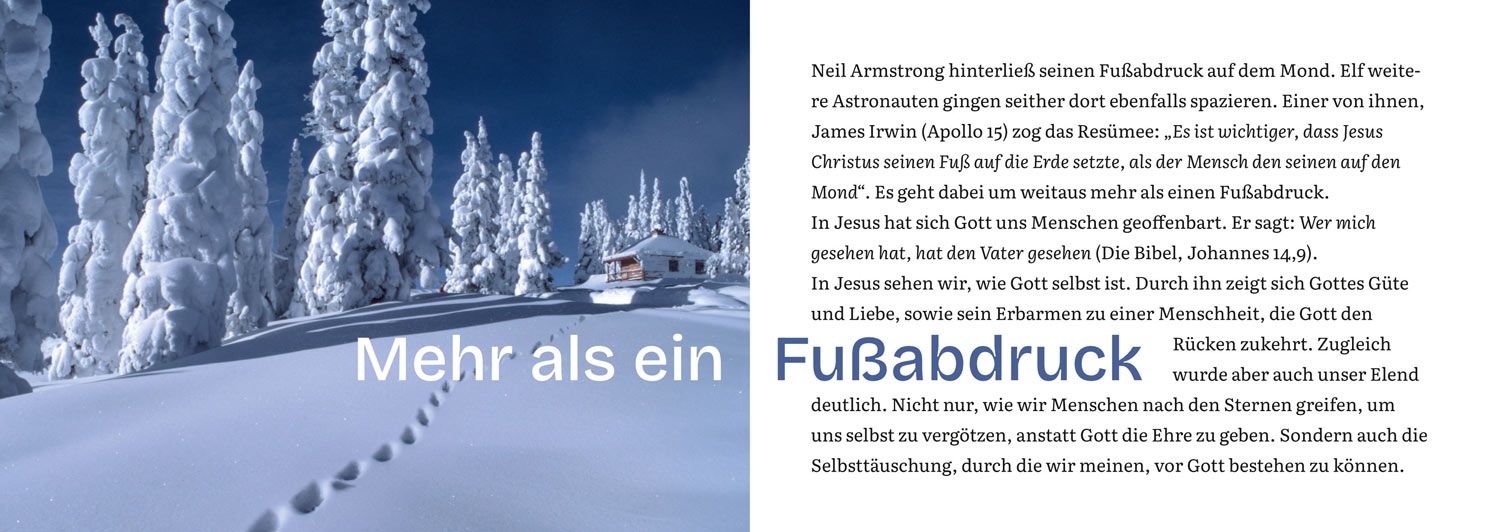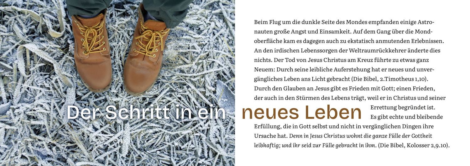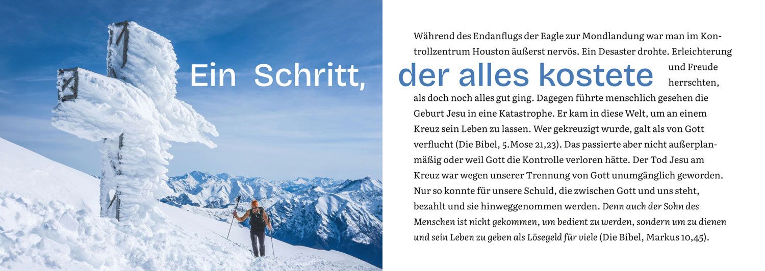Als Neil Armstrong am 21. Juli 1969 als erster Mensch seinen Fuß auf den Mond setzte, prägte er den berühmten Satz: "Ein kleiner Schritt für einen Menschen, aber ein großer Sprung für die Menschheit". Für die Menschheit änderte sich durch dieses Ereignis jedoch nichts. Zwei Jahre später betrat auch James Irwin den Mond und stellte fest: "Es ist wichtiger, dass Jesus Christus seinen Fuß auf die Erde setzte, als der Mensch den seinen auf den Mond". Jesus Christus hat den größten Schritt für die Menschheit getan. Er verließ den Himmel, um für unsere Sünden zu sterben. Der größte Schritt, den ein Mensch tun kann, ist, an ihn zu glauben.