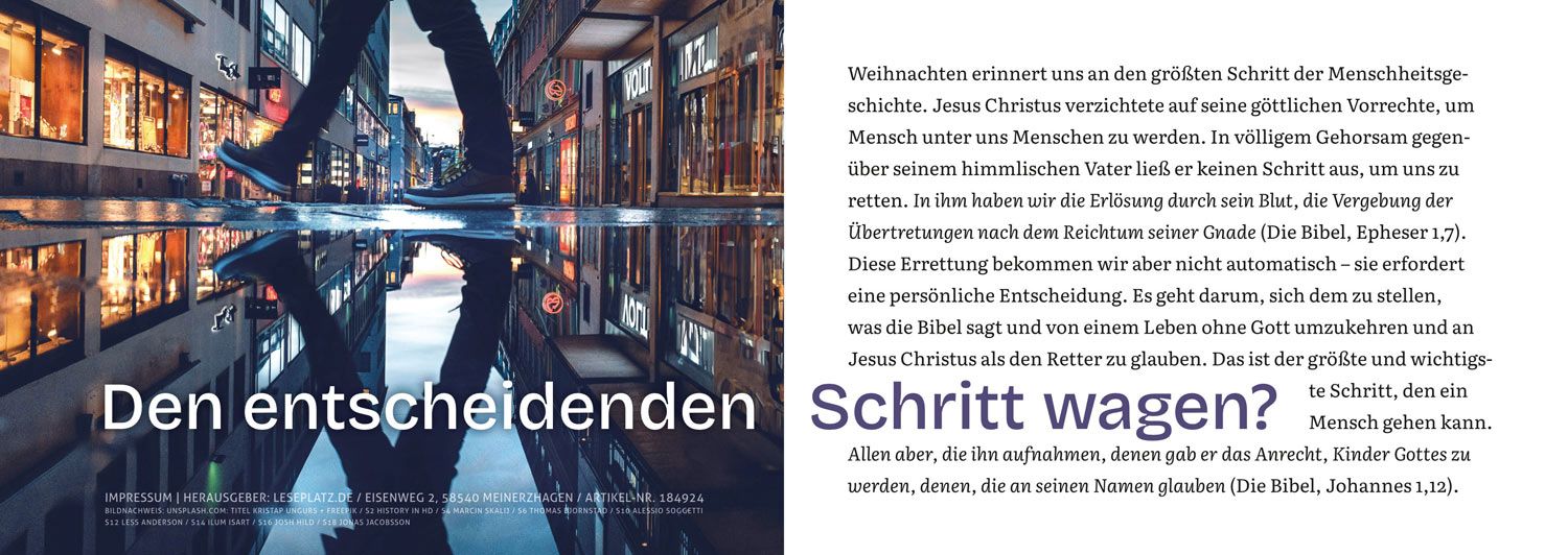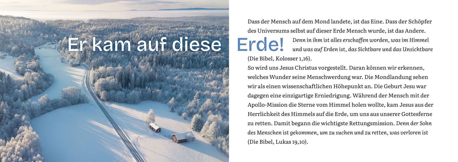 Ein ansprechend gestaltetes, evangelistisches Weihnachts-Verteilheft. Sehr gut geeignet, um es in der Nachbarschaft zu verteilen, im Bekanntenkreis, am Arbeitsplatz, auf Weihnachtsmärkten oder als wegweisende Beigabe zu einem Geschenk.