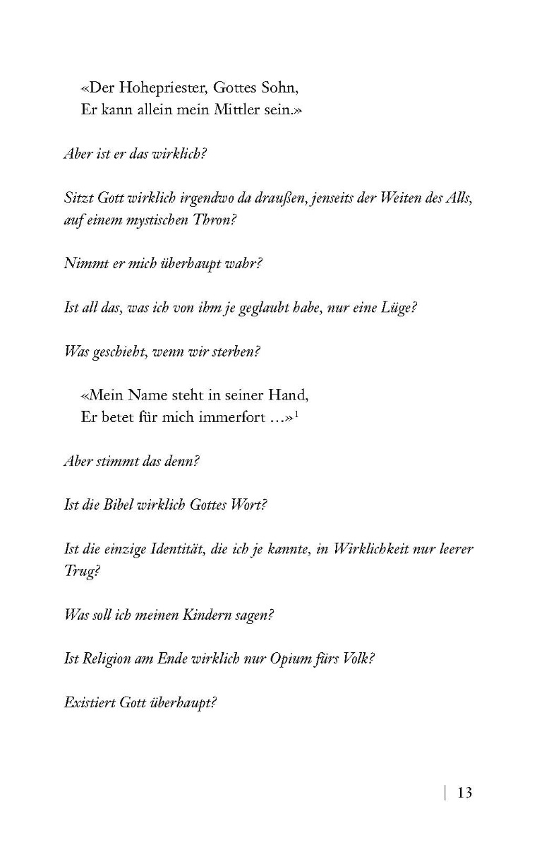 Dieses Buch ist ein starker Anker gegen gewisse Unterströme der postevangelikalen Theologie, die seit Jahren die apologetischen Fundamente der Kirche unterspülen. Dies führt mittlerweile zu einer ernsthaften Erosion des Glaubens. Alisa Childers beschreibt eindrücklich, was ihren eigenen Glauben ins Wanken gebracht hat, welche konstruktivistischen Denkfiguren hier toxisch und destabilisierend wirkten und wie sie durch den Zweifel hindurch einen gefestigten Jesus-Glauben zurückgewinnen konnte.