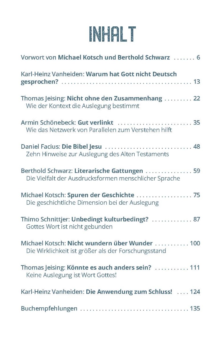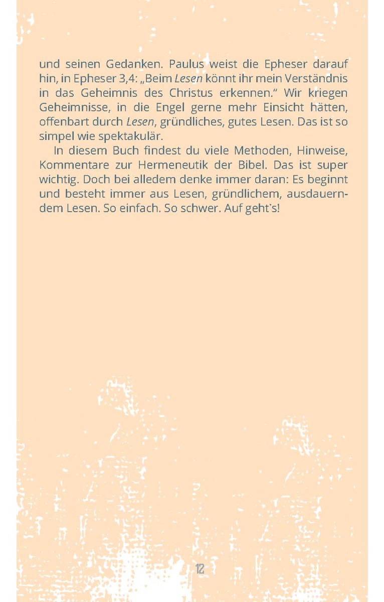 In diesem Buch wird erklärt, worauf es bei der richtigen Einordnung biblischer Aussagen ankommt In 10 x 10 prägnanten Punkten werden Hintergrundinformationen und Arbeitshilfen geboten. Damit kann man effektiver und sensibler die Bibel lesen und Bibeltexte für Hauskreise oder Gesprächsgruppen vorbereiten. Dieses Buch beugt der heute gängigen Meinung vor, man könne die Bibel weitgehend willkürlich interpretieren, wie es einem gerade gefällt.
