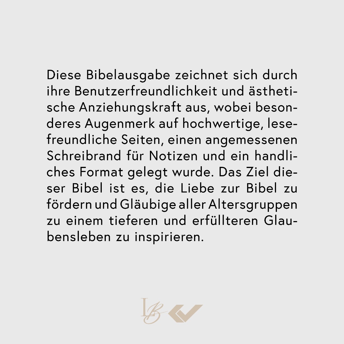 Diese Bibelausgabe zeichnet sich durch ihre Benutzerfreundlichkeit und ästhetische Anziehungskraft aus, wobei besonderes Augenmerk auf hochwertige, lesefreundliche Seiten, einen angemessenen Schreibrand für Notizen und ein handliches Format gelegt wurde. Das Ziel dieser Bibel ist es, die Liebe zur Bibel zu fördern und Gläubige aller Altersgruppen zu einem tieferen und erfüllteren Glaubensleben zu inspirieren.