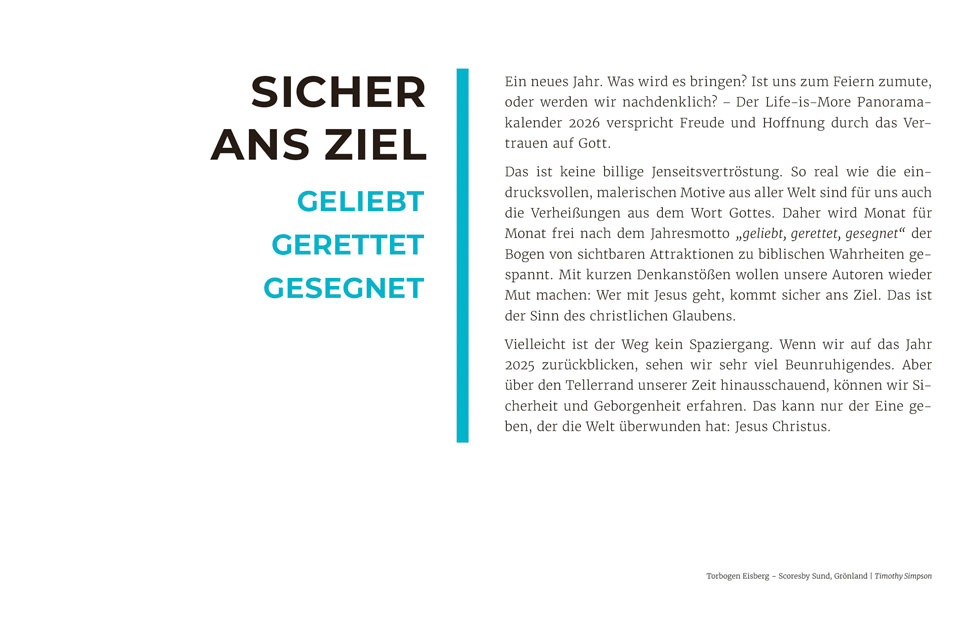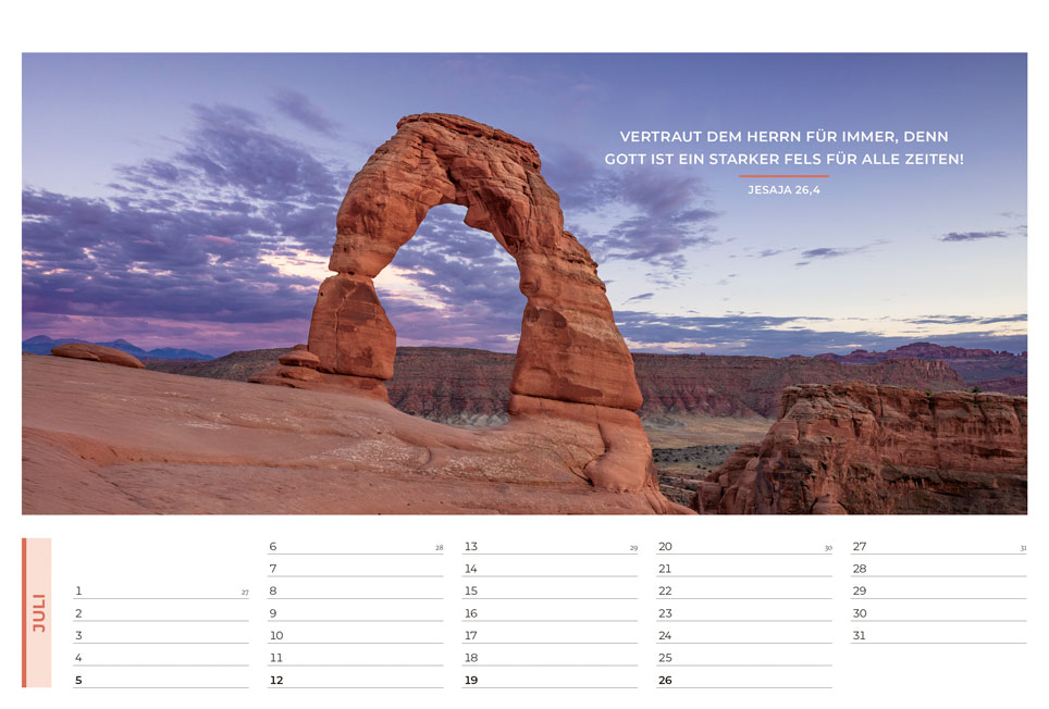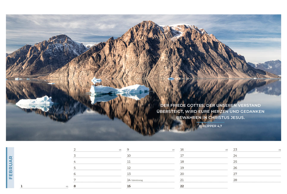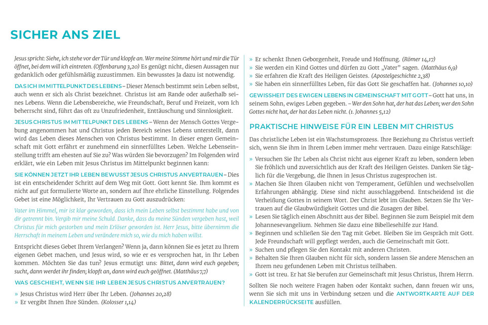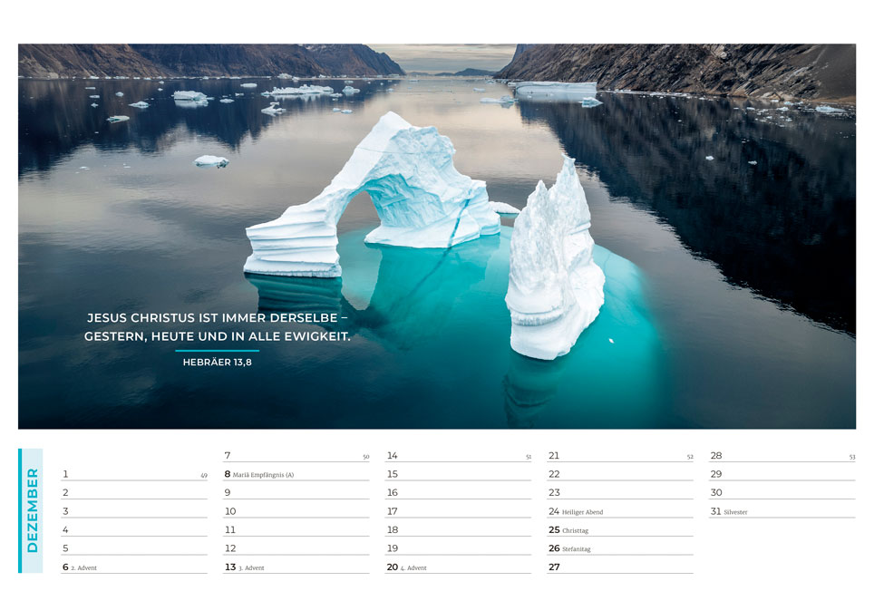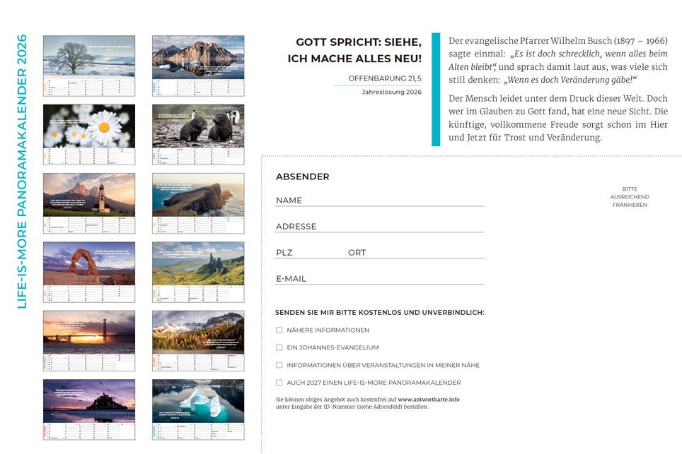 Der evangelistische Wand- und Tischkalender mit tollen Fotos! Ideal zum Weitergeben in großer Stückzahl oder zu Weihnachten Mit Hoffnung und Mut machenden Bibelversen sowie evangelistischen Texten auf der Rückseite jedes Kalenderblattes Am Ende des Kalenders wird erklärt, wie man eine Beziehung zu Gott bekommt Grußkarten-Funktion der Monatsblätter durch beschreibbare Rückseite.