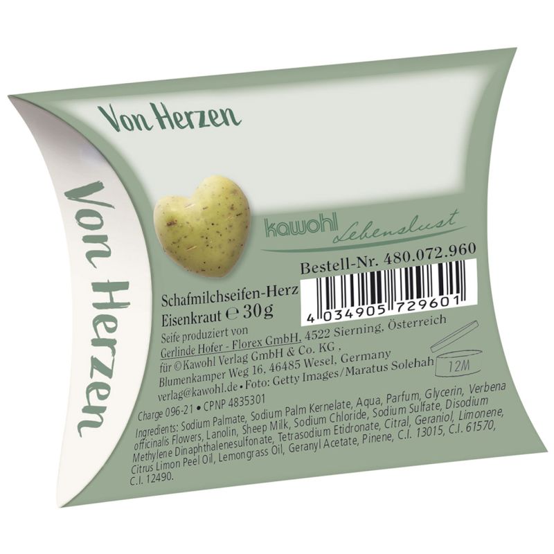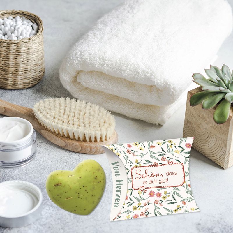 Original Schafmilchseife (30 g) in Herzform umhüllt von guten Gedanken.
