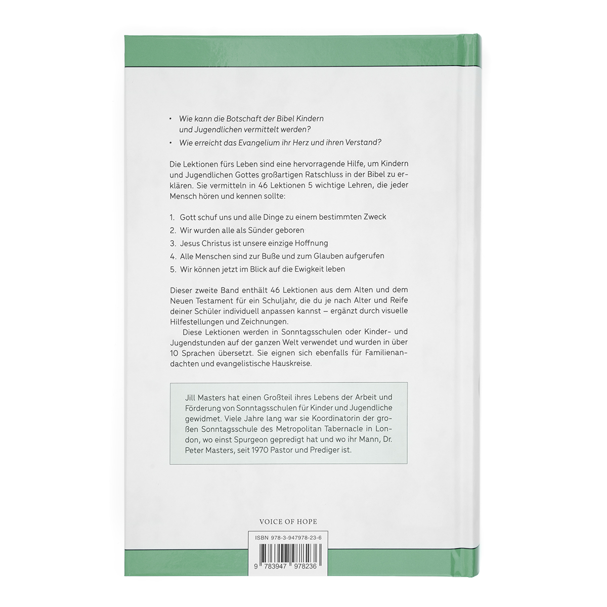 Dieser zweite Band enthält 46 Lektionen aus dem Alten und dem Neuen Testament für ein Schuljahr, die du je nach Alter und Reife deiner Schüler individuell anpassen kannst – ergänzt durch visuelle Hilfestellungen und Zeichnungen. Diese Lektionen werden in Sonntagsschulen oder Kinder- und Jugendstunden auf der ganzen Welt verwendet und wurden in über 10 Sprachen übersetzt. Sie eignen sich ebenfalls für Familienandachten und evangelistische Hauskreise.