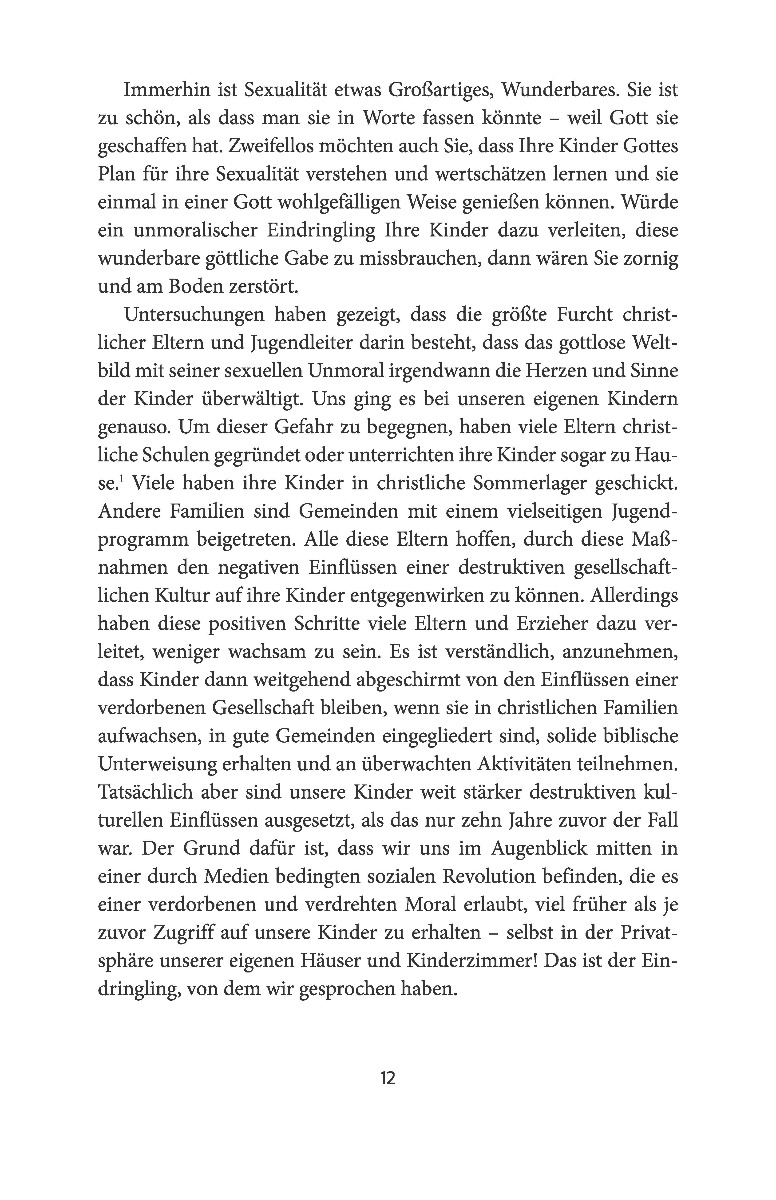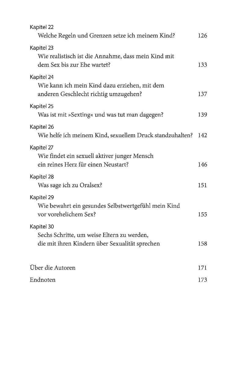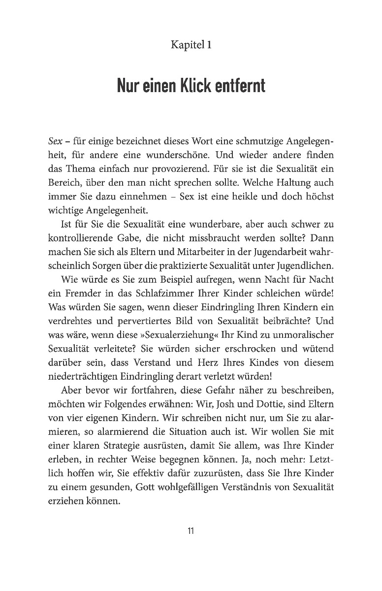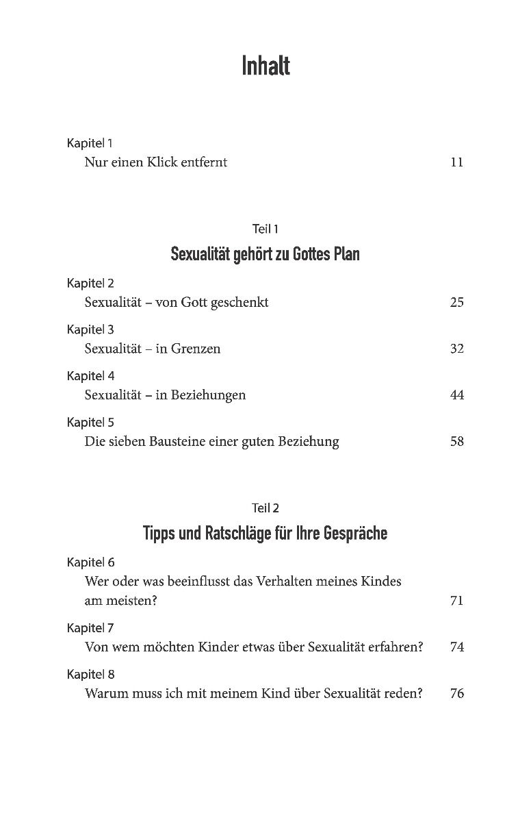 Wer redet mit Ihren Kindern über Sexualität? In unserer sexu alisierten und von Medien bestimmten Welt können Sie sich zw ar sicher sein, dass das Thema nicht an Ihren Kindern vorbei geht. Aber ist das, was sie hören, auch das, was sie hören s ollen? Wohl eher nicht. Sie als Eltern sind genau die Richti gen, um mit Ihren Kindern über Gottes Plan für Sexualität zu reden. Statistiken zeigen, dass Ihre Kinder sich das auch g enau von Ihnen am liebsten wünschen! Dieses Buch liefert vie ärt ebenso, warum gute Gespräche nur innerhalb guter Beziehu ngen stattfinden können. Es will Ihnen dabei helfen, * Sexua lität im biblischen Licht zu betrachten * offen, aber behuts am mit Ihren Kindern darüber zu sprechen * lehrreiche Augenb licke wahrzunehmen und auf Fragen einzugehen * Ihre Kinder l iebevoll zu prägen und zu formen.